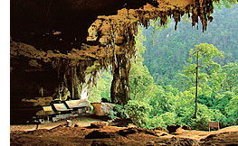 Niah National Park is 480km up the coast from Kuching and spreads over 3,140 hectares of peat swamp, forests, limestone formations, and caves. Its main attraction is the Niah Great Cave, a world renowned archeological site where a 40,000-year-old skull was unearthed, along with tools and ornaments dating back to the Stone Age. Another popular attraction is the Painted Cave, used by prehistoric man for religious and burial rituals. This is also the site of the famous cave paintings, and depictions of human figures rendered in thick red hematite cover some 30m of the interior walls.