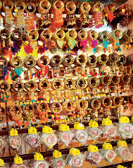 The Indians love adorning their bodies, whether it is with scent, colour, flowers or jewellery, and I adore the many stores which sell a hundred and one different items specifically for this purpose, ranging from natural henna to colourful trinkets or gold jewellery. Young Indian maidens used to signal their unmarried status with a mark on their forehead made from special dyes. Tradition has moved with the times, and now they use trendy ready-made stick-ons of all colours and shapes.